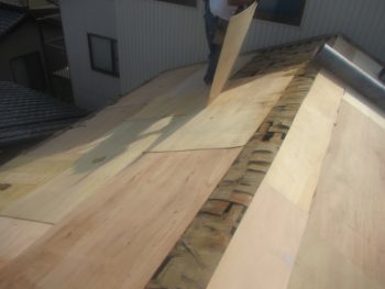 瓦桟を取り除き、コバ板の上にベニヤ板を打ちます。