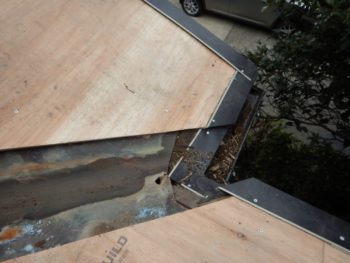 現調したところ、谷部が鉄板で錆びて穴が開いていました。ここから雨が漏ったようです。瓦の葺き替えしたいとのことでしたが、先に外壁に板金を張った為、