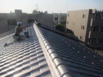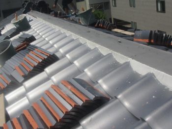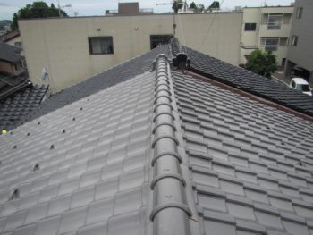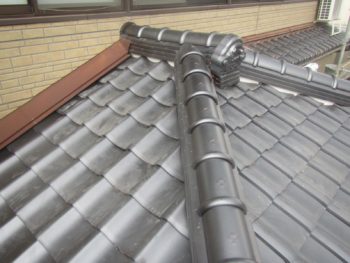 隅棟の鬼を取り付け、のし瓦を積み重ねます